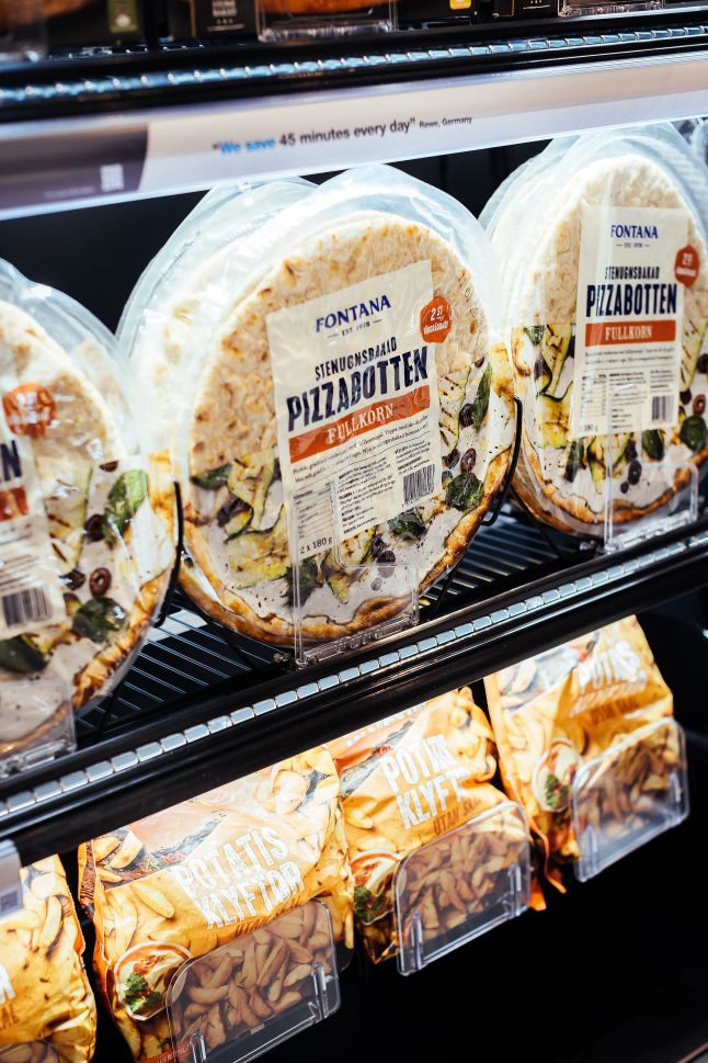 The system automatically pushes products to the front of the shelf, keeping displays tidy and well organised. Special wire side panels securely hold round pizza packaging and ensure excellent product visibility in refrigerated cabinets and retail shelving.